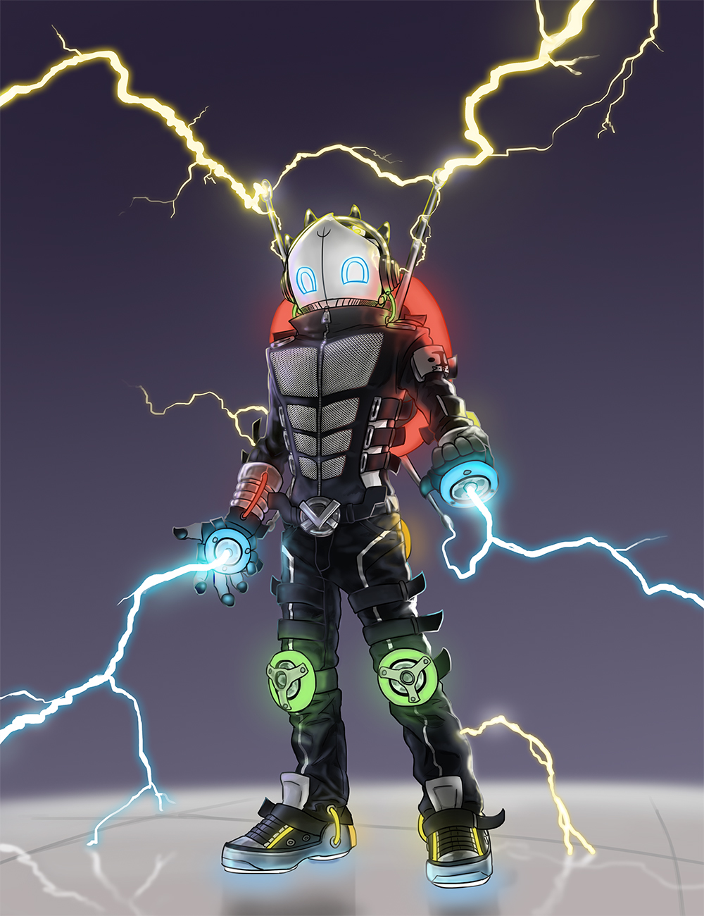 vOx is a superhero DJ with electric powers from his speaker inventions. Living in a futuristic cyberpunk city, he is a musician on stage and a hero behind the stage who fights rampaging robots.