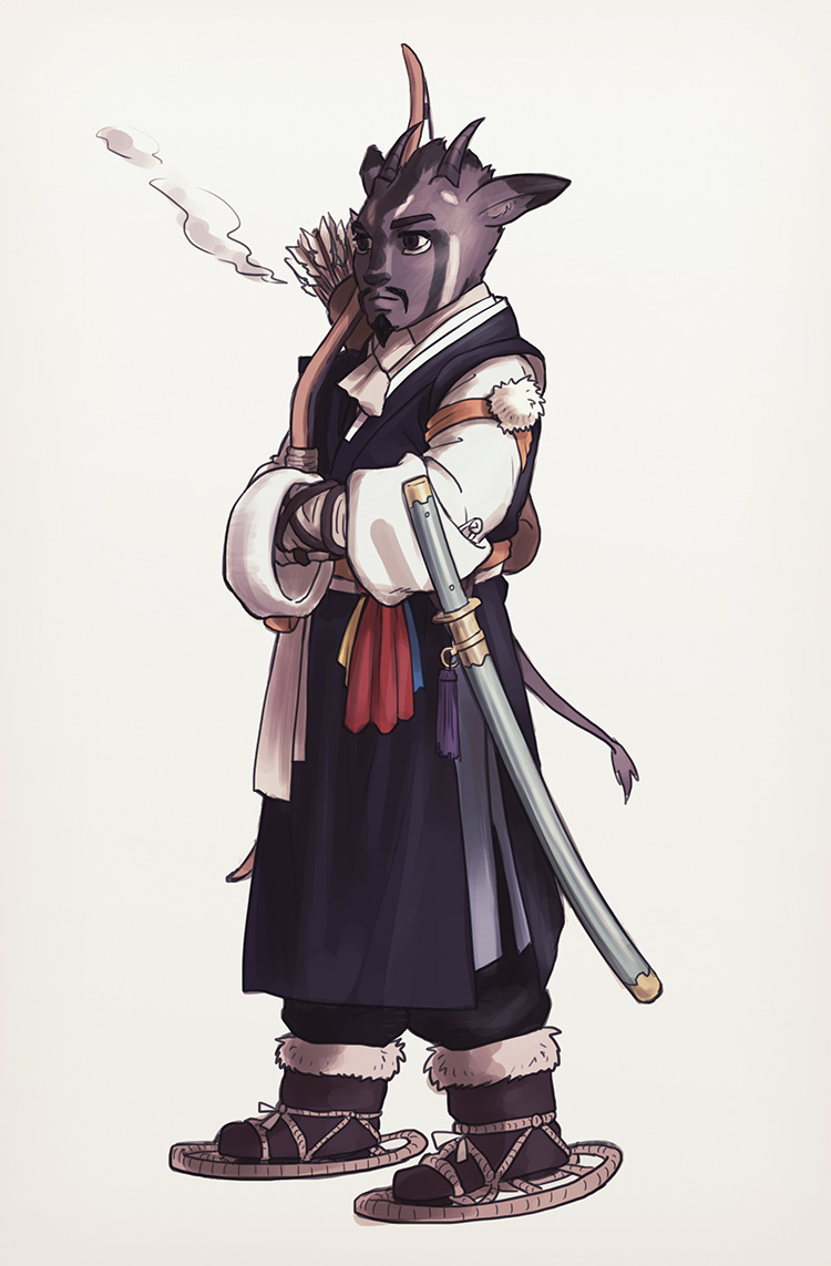Owon and his senior are part of a hunter tribe. Their design is based on a wild mountain goat called 'sanyang'.